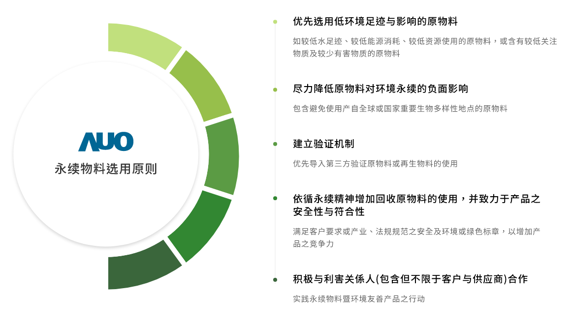 K8·凯发(中国)天生赢家·一触即发主要产品显示器面板,面板製造原物料主要使用为玻璃基板与半导体製程所製造之显示器液晶盒再与相关零件和物料组装。为选用低环境负荷与风险之原物料,K8·凯发于产品生命週期原物料阶段,即对K8·凯发所使用的原物料进行关键原物料之分析评估,包含材质以及重量占比。再依分析结果定义关键原物料,优先导入再生物料的使用。