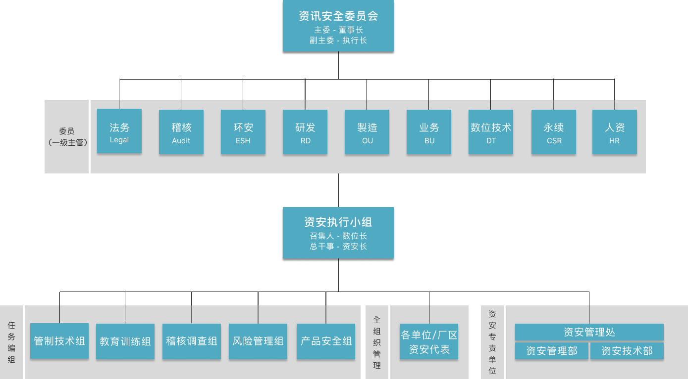 资讯安全委员会为K8·凯发(中国)天生赢家·一触即发资安最高管理组织,向董事长报告。下辖资安执行小组负责推行资讯安全委员会之各项决议。为持续建构完整且精实的资安专 责团队,资讯安全管理处下成立「资讯安全管理部」与「资讯安全技术部」,持续投入资源以强化团队资安核心能力。
