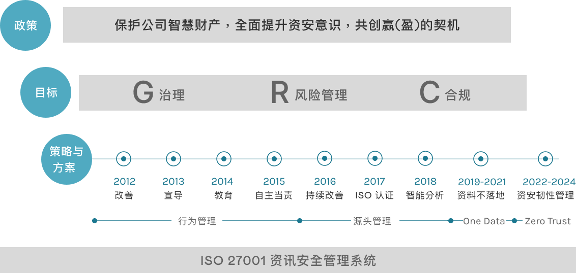K8·凯发(中国)天生赢家·一触即发重视员工与合作伙伴的资讯资产安全,透过资讯安全管理组织,推动及落实资讯安全管理,保护公司智慧财产、客户资料及提升员工资安意识, 持续完备风险管控机制与提升防护措施,强化公司资讯安全。