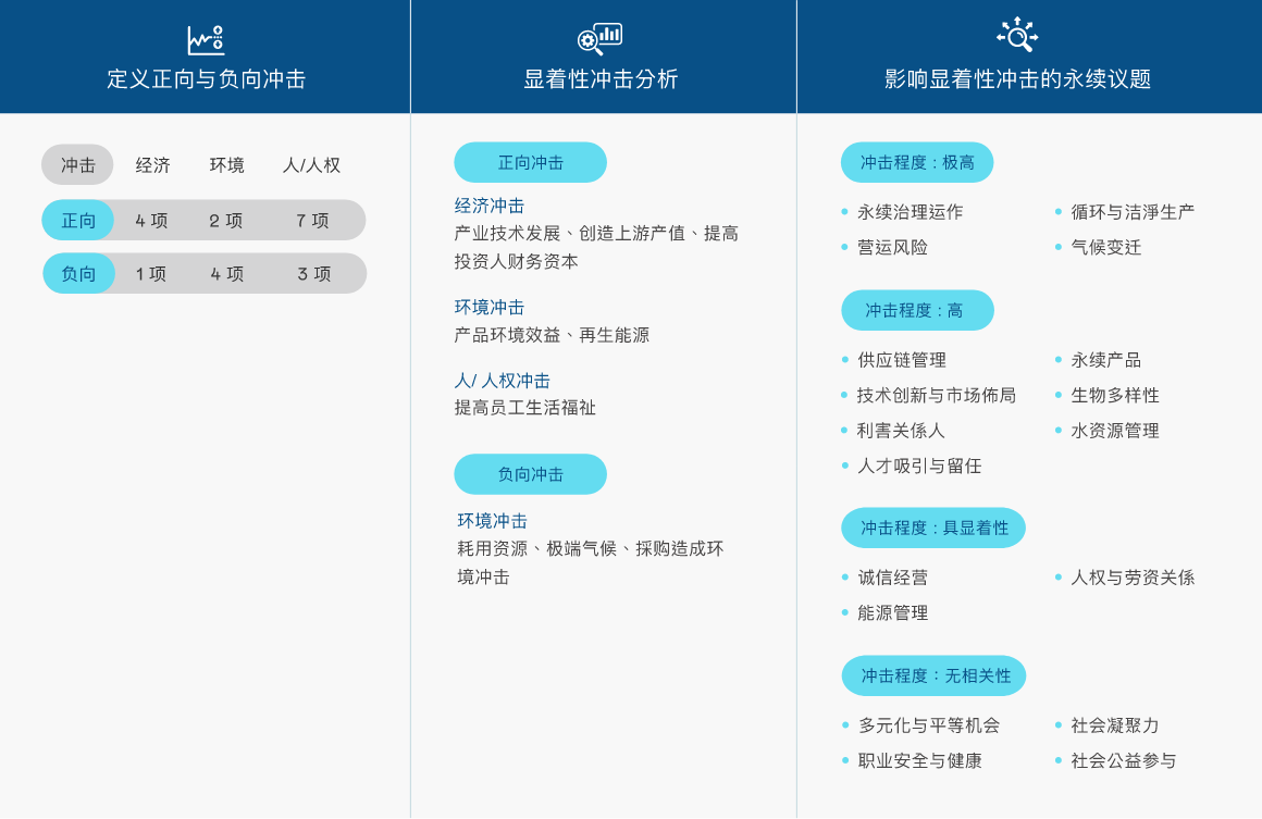 依循全球永续趋势与GRI 准则检视议题之合适性,透过问卷了解利害关系人对公司在环境、社会( 含人权)、公司治理三方面的关注面向,同时建立双重重大性评估方法,透过K8·凯发(中国)天生赢家·一触即发主管与价值链的关键伙伴评估ESG 议题对公司所产生的营运冲击程度,并在ESG 外部永续发展冲击方面,根据GRI 通用准则2021(GRI Universal Standards 2021) 的GRI 3:重大主题(Material Topics 2021),整合价值平衡联盟(Value Balancing Alliance, VBA)、哈佛商学院「影响力加权会计(Impact-Weighted Accounts)」研究计画等机构发展之经济、环境及社会层面冲击评估方法学,建构以冲击为基础的重大性分析流程,辨识重大性主题。