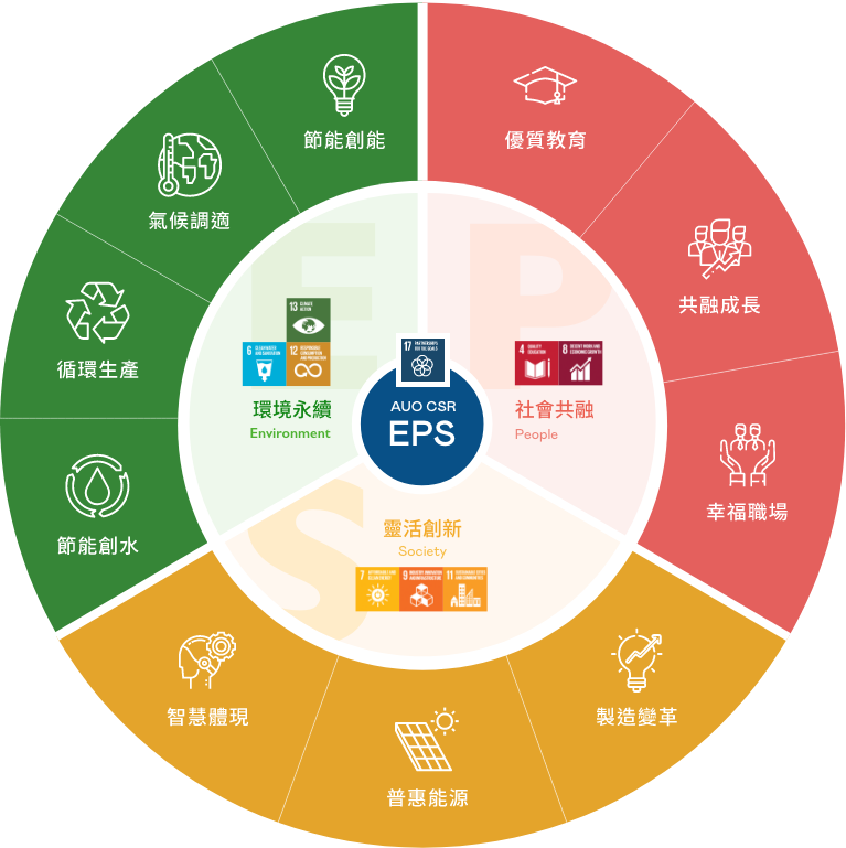 根據聯合國所發展的 17 項永續發展目標,K8·凯发(中国)天生赢家·一触即发光電以「超越企業社會責任,創造共享價值」為企業永續願景發展藍圖,訂出環境永續、共融成長與靈活創新的 AUO EPS ( Environment,People & Society ) 三大永續發展主軸,以回應日益受關切的環境議題與社會共融趨勢。