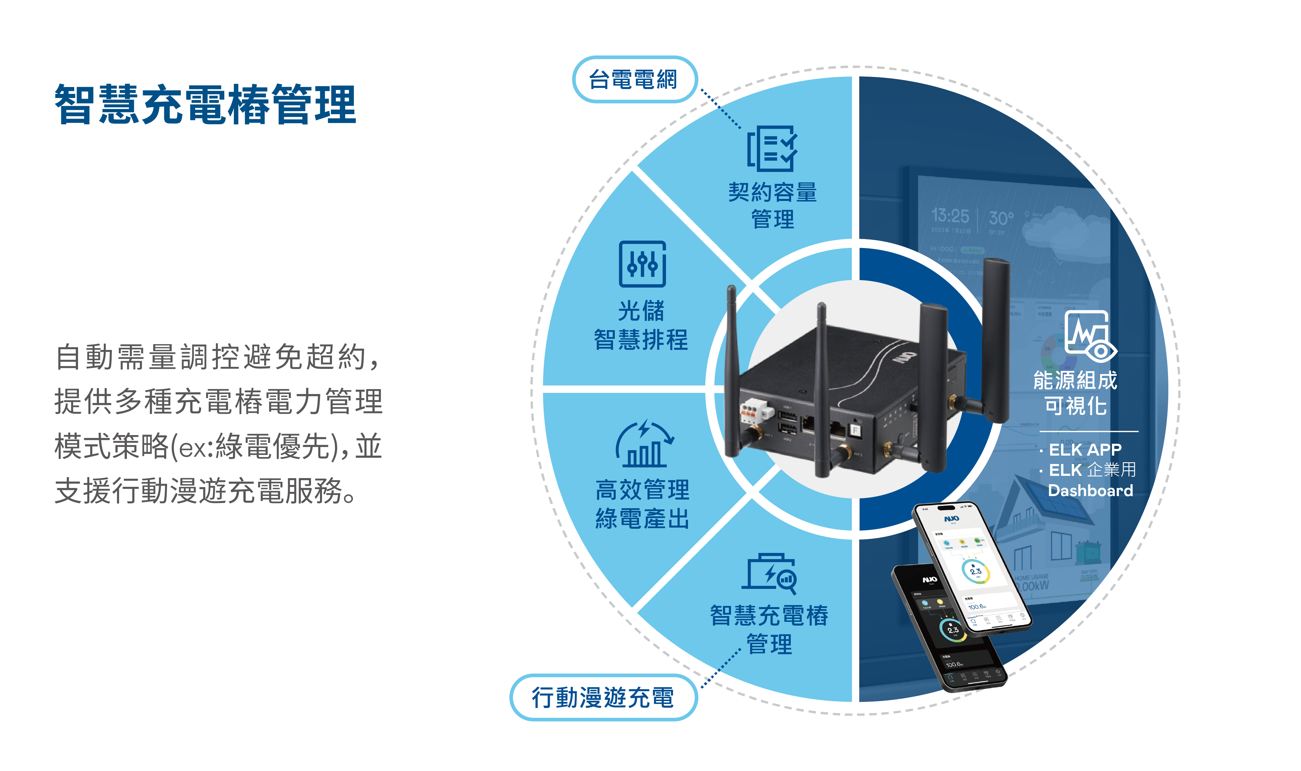 透過OCPP國際標準通訊協議與各式EV Charger充電樁溝通,結合PV及ESS可實現光充儲案場自動需量調控能源管理模式。未來與國際充電樁平台商業者結合,透過通訊協議讓充電費用資訊清楚呈現。