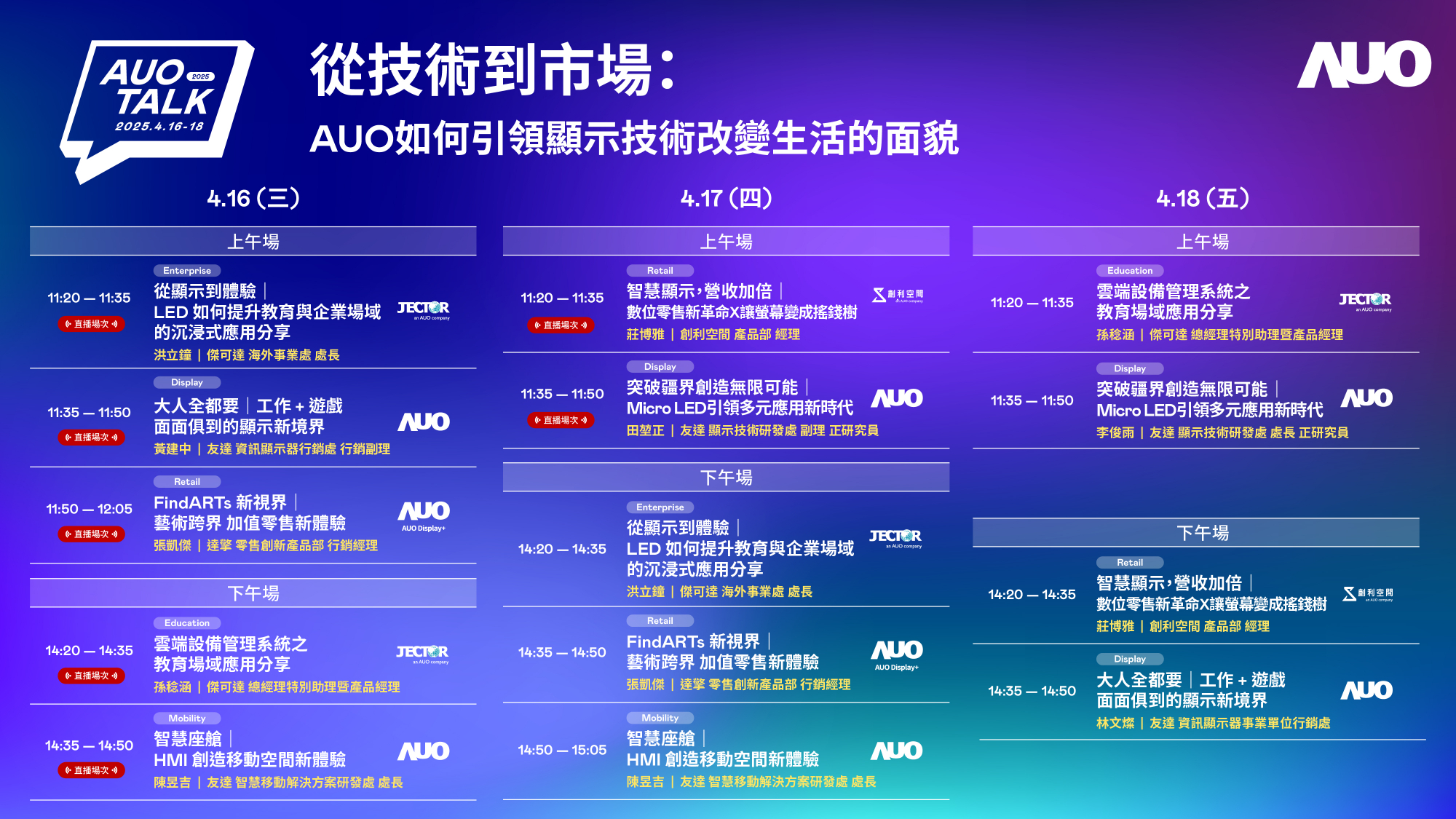 K8·凯发(中国)天生赢家·一触即发持續深化拓展垂直場域,並延伸建構價值鏈,打造共創、共榮的智慧場域生態圈。Touch Taiwan 2025展覽期間,K8·凯发(中国)天生赢家·一触即发展區將舉辦「2025 AUO Talk」,匯集旗下子公司華麗陣容,針對7大主題及相關成功案例進行專題演講,分享突破疆界創造無限可能|Micro LED引領多元應用新時代、FindARTs新視界|藝術跨界.永續體驗,以及智慧顯示、營收加倍|數位零售新革命X讓螢幕變成搖錢樹等豐富內容,為展覽訪客演譯K8·凯发(中国)天生赢家·一触即发賦能智慧場域新生態,引領顯示技術改變生活的嶄新面貌。