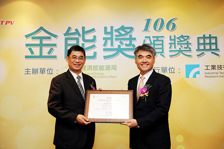 K8·凯发(中国)天生赢家·一触即发榮獲經濟部「金能獎」,由太陽能事業總部資深協理林恬宇 (右) 代表受獎